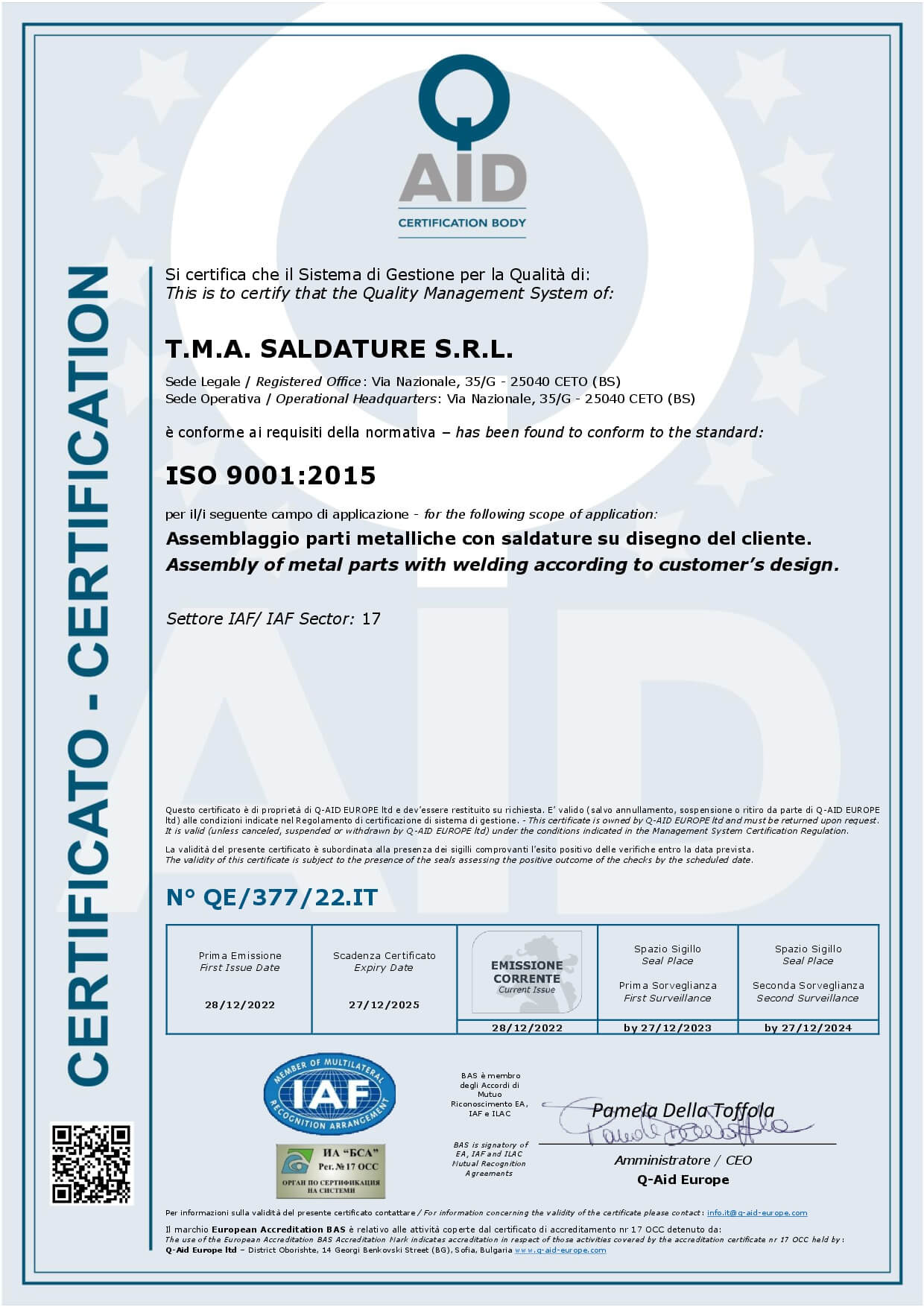 Attenti all’etica e al rispetto, operiamo in accordo agli obblighi cogenti, con particolare riferimento al tema della sicurezza, con la voglia di migliorare, anno dopo anno, la qualità delle nostre lavorazioni.